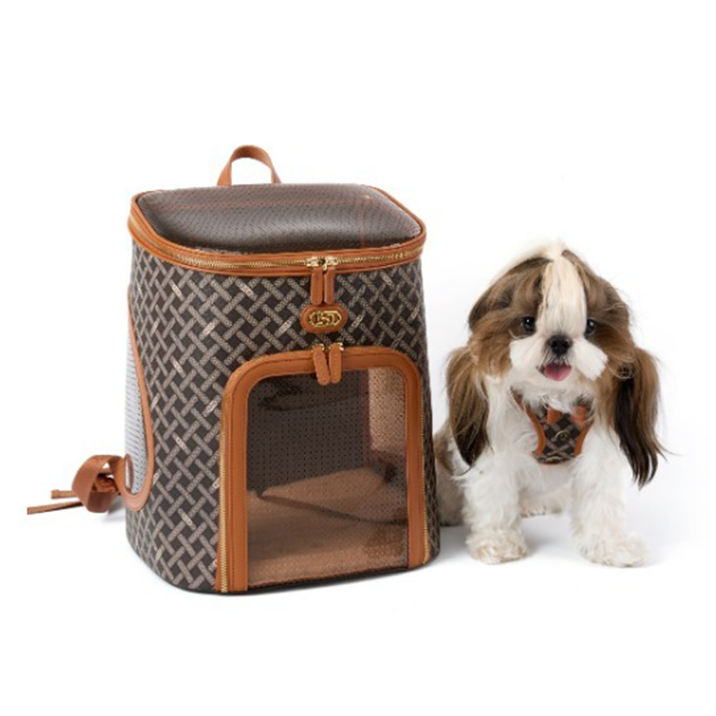This pet carrier backpack is constructed of top-grain leather, PVC, microfiber, TPU, and electroplated hardware. It features an integrated window opening with anti-escape hooks and front and back openings on both sides for easy entry and exit.
